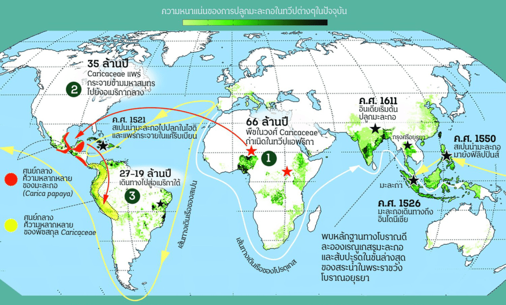 Sources: (1) A BRIEF HISTORY OF CHILI PEPPERS, LegalNomads.com, 17 JAN 2022; (2) Papaya – American Indian Health and Diet Project, Scott Han Sheu; (3) รู้ยัง? มะละกอ มาจากเมือง “มะละกา” แต่แปลว่า “มะขามป้อม”งงไหม ?, MatichonOnline.com, 13 FEB 2017; (4) มะละกอ แหล่งกำเนิด เส้นทางการกระจายพันธุ์, BioThai.net, 4 JAN 2023; (5) ส้มตำทำไมไม่เรียกมะละกอตำ, Guru.Sanook.com, 26 NOV 2013; “มะละกอ” พืชต่างถิ่นเข้าสู่ไทยเมื่อใด? ทำไมคนอีสานเรียกว่า “บักหุ่ง”, Silpa-mag.com