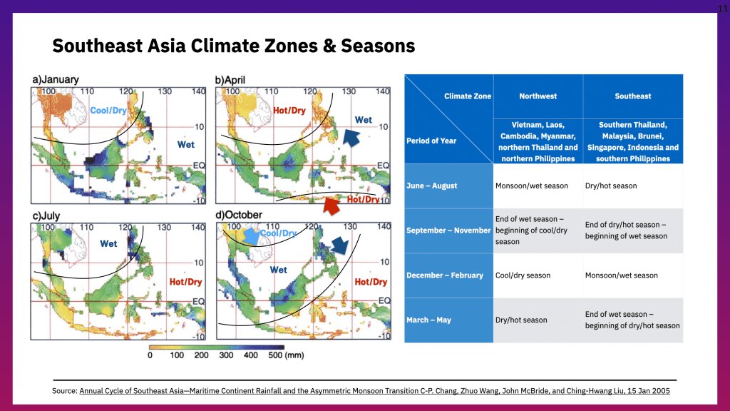 พอเห็นดังนี้ ก็เลยได้มาพบว่าเอเชียตะวันออกเฉียงใต้นั้นมีโซนภูมิอากาศ 2 โซนด้วยกัน คือ ตะวันออกเฉียงใต้ที่มีอินโดนีเซีย มาเลเซีย บรูไน สิงคโปร์ และฟิลิปปินส์ตอนใต้ กับตะวันตกเฉียงเหนือที่มีไทย เมียนมาร์ ลาว กัมพูชา เวียดนาม และฟิลิปปินส์ตอนเหนือ ซึ่งจะมีสภาพอากาศตรงข้ามกัน คือ ถ้าฝั่งหนึ่งมีมรสุม อีกฝั่งจะแล้งนั่นเอง