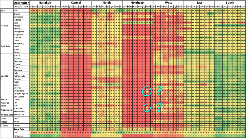 ส่วนชาวต่างชาติที่เข้ามาท่องเที่ยวในเมืองไทยเองก็ดูจะคล้าย ๆ กัน แต่สำหรับกรุงเทพฯ กลับมีจำนวนนักท่องเที่ยวเข้ามาค่อนข้างมากในช่วงหน้าฝน และมีกลุ่มนักท่องเที่ยวที่ไปภาคตะวันออกเฉียงเหนือมากผิดปรกติในเดือนตุลาคม ทำให้ผมสงสัยว่าคนเหล่านั้นคือคนประเภทไหนกัน?