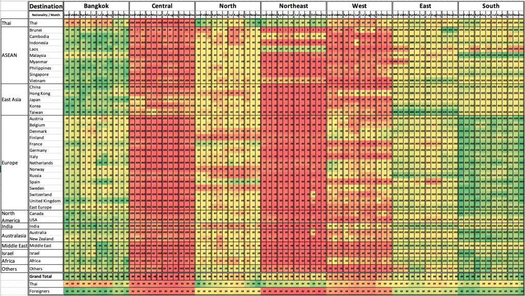 แต่ผมก็ยังไม่หยุดความเนิร์ดไว้แค่นั้น และได้ลองทำตาราง Heat Map นักท่องเที่ยวของแต่ละชาติ และภาคของไทยที่เขาไปท่องเที่ยว ดังแสดงในภาพด้านล่าง