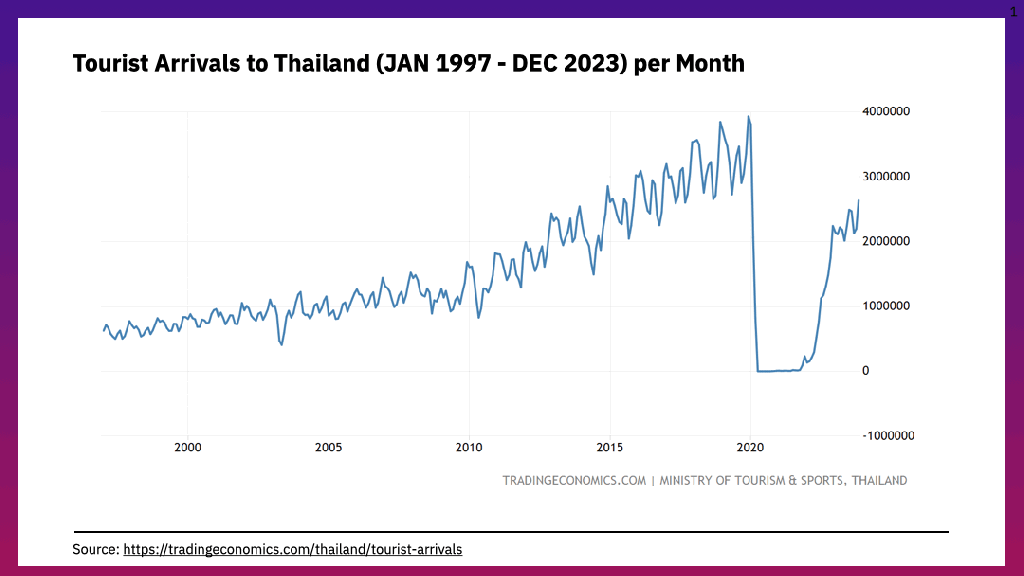 จากจำนวนชาวต่างชาติที่เข้ามาท่องเที่ยวในประเทศไทยในแต่ละเดือนระหว่าง พ.ศ. 2540-2566 (ค.ศ. 1997-2023) จากฐานข้อมูลของกระทรวงท่องเที่ยวและกีฬา 1 จะสามารถเห็นได้ว่ามี pattern บางอย่างอยู่ คือจำนวนนักท่องเที่ยวจะมีเนิน peak สองช่วง คือในช่วงฤดูหนาวระหว่างเดือนธันวาคม-มกราคม และรองลงมาในช่วงเดือนกรกฎาคม-สิงหาคม ซึ่งเป็นฤดูฝน
