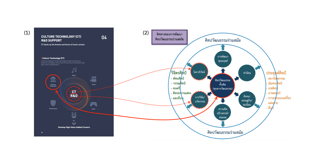 นอกจากนี้ ผมเคยศึกษาเกี่ยวกับทิศทางของการพัฒนาศิลปวัฒนธรรมร่วมสมัยใน นโยบายและยุทธศาสตร์ ส่งเสริมศิลปวัฒนธรรมร่วมสมัย (พ.ศ. ๒๕๖๐ – ๒๕๖๔) อีกทั้ง แผนปฏิบัติการด้านส่งเสริมศิลปวัฒนธรรมร่วมสมัย (พ.ศ. 2566-2570) (หน้าที่ 15) ที่ให้คำจำกัดความของ “ศิลปวัฒนธรรมร่วมสมัย” ว่า “เป็นการผสมผสานระหว่างศิลปวัฒนธรรมดั้งเดิมและศิลปวัฒนธรรมสมัยใหม” ซึ่งอาจทำให้สามารถตีความได้ว่า กระทรวงวัฒนธรรมต้องการให้ศิลปวัฒนธรรมร่วมสมัยต้องต่อยอดจากศิลปวัฒนธรรมดั้งเดิม หรือทุนทางวัฒนธรรมเท่านั้น (แม้ว่าคำว่า “ร่วมสมัย” จะมีความหมายแท้จริงว่าความนิยมใน “สมัยปัจจุบัน” ก็ตาม) แล้วค่อยมีเทคโนโลยี การวิจัย และนวัตกรรมมาประกอบ ซึ่งตรงข้ามกับแนวคิดของ Korea Creative Content Agency หรือ KOCCA ที่เป็นหน่วยงานที่รับผิดชอบเรื่องการพัฒนานวัตกรรมด้านศิลปวัฒนธรรมร่วมสมัยของรัฐบาลเกาหลีใต้ ที่นโยบายการพัฒนาคอนเท้นต์นั้นจะให้เทคโนโลยี การวิจัย และนวัตกรรม หรือ CT R&D เป็นศูนย์กลางการพัฒนาคอนเท้นต์ แล้วทุนทางวัฒนธรรมดั้งเดิม (Cultural Properties) เป็นเพียงหนึ่งในองค์ประกอบ