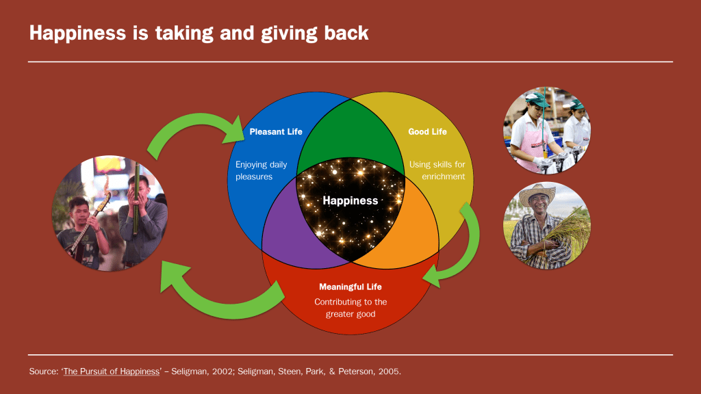 หลังจากที่วิเคราะห์ 3 องค์ประกอบแห่งความสุขแล้ว ผมรู้สึกว่ามันคือวัฏจักรของการให้และการรับ (a cycle of taking and giving back) ยกตัวอย่างเช่น หากความเพลิดเพลินจากการฟังดนตรี (the pleasant life) ทำให้มีกำลังใจในการทำงานที่ดี (the good life) ก็จะสามารถทำให้มีรายได้ที่จะจุนเจืออาชีพนักดนตรีที่ทำให้ชีวิตเรามีความเพลิดเพลินได้ (the meaningful life) วนเวียนกลายเป็นวัฎจักรที่ยั่งยืนได้