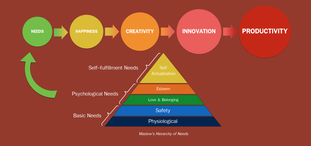 โดยส่วนแล้ว ผมเชื่อว่าความสุขเป็นปัจจัยหนึ่งที่ขับเคลื่อนความคิดสร้างสรรค์ ซึ่งบางคนอาจโต้แย้งว่า มีการศึกษาที่แสดงความสัมพันธ์ระหว่างภาวะซึมเศร้าและความคิดสร้างสรรค์ที่พบว่าศิลปินระดับโลกหลายคนเป็นโรคซึมเศร้า แต่ผมคิดว่ามันจะเป็นความสร้างสรรค์ที่ไม่ยั่งยืน อีกทั้งสำหรับคนปรกติทั่วไป มันค่อนข้างยากที่จะมีความสุขได้หากไม่สามารถเข้าถึงความต้องการขั้นพื้นฐาน (อ้างอิงทฤษฎีลำดับขั้นความต้องการของมาสโลว์ท่ีกล่าวแล้วด้านบน) ซึ่งทำให้ผมเขียนแผนภาพแรกดังแสดงด้านล่างนี้
