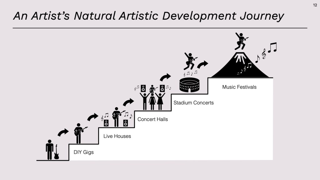 Although not every artist makes it to the top, they follow a general development journey—starting by playing small shows, honing their craft, and playing bigger shows to larger audiences.