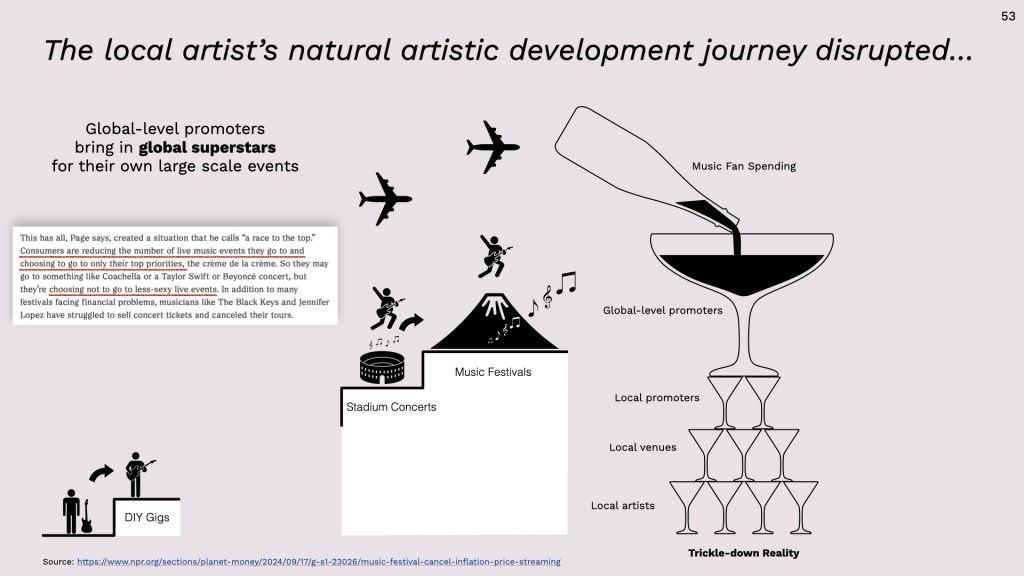 According to an article on NPR.org (17 SEP 2024), the live music industry experienced a strong rebound after the COVID-19 pandemic as audiences rushed back to concerts and festivals. However, the resurgence was short-lived as numerous festivals began canceling due to rising production costs, softening demand, and a noticeable shift in consumer spending. Many fans are now saving their money for premium events—the crème de la crème—such as Coachella or stadium tours by artists like Taylor Swift and Beyoncé. The result is a top-heavy economy that functions like a dam rather than a waterfall: money pools at the top among superstars, leaving the local grassroots ecosystem downstream to run dry.