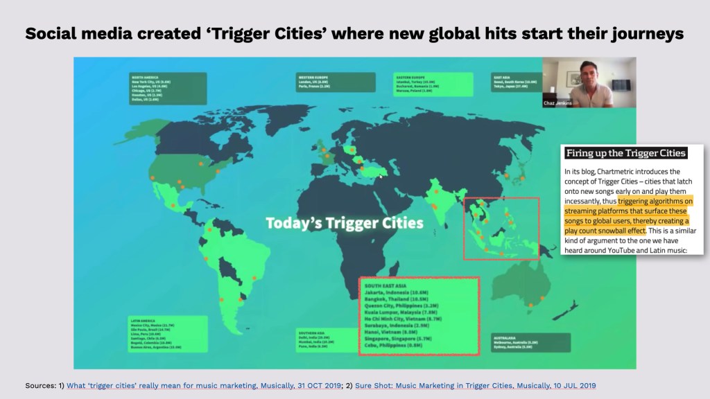 Another factor is the emergence of ‘Trigger Cities’—densely populated hubs in developing regions like Latin America and Southeast Asia. In these markets, new tracks can go viral rapidly, ‘triggering’ streaming algorithms that spark a global snowball effect. Because digital marketing and advertising costs are significantly lower in these territories, it seems like a plausible cost-efficient strategy for major labels to test and amplify their global hits before they ever reach Western markets (Sure Shot: Music Marketing in Trigger Cities, Musically, 10 JUL 2019).